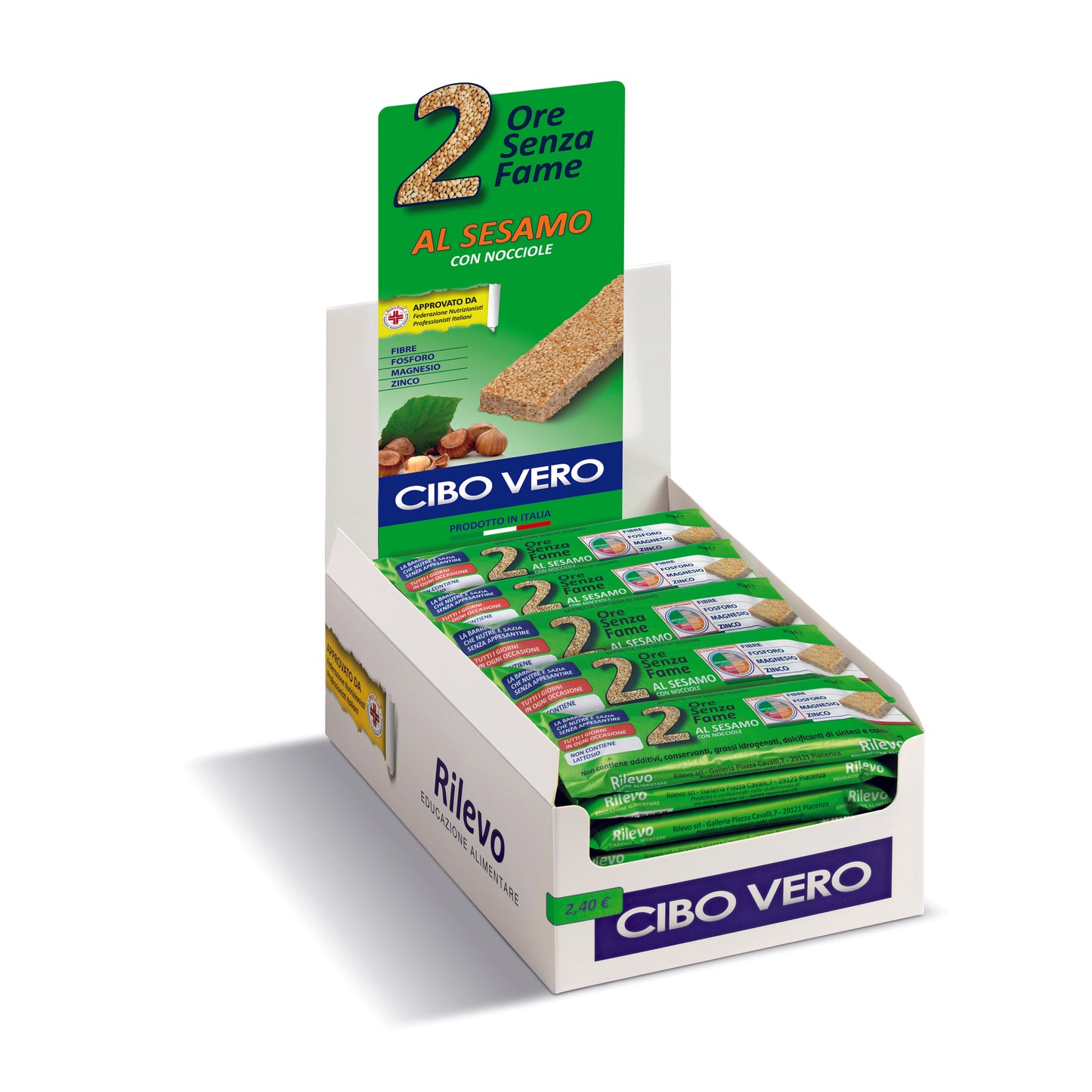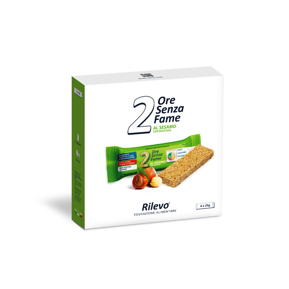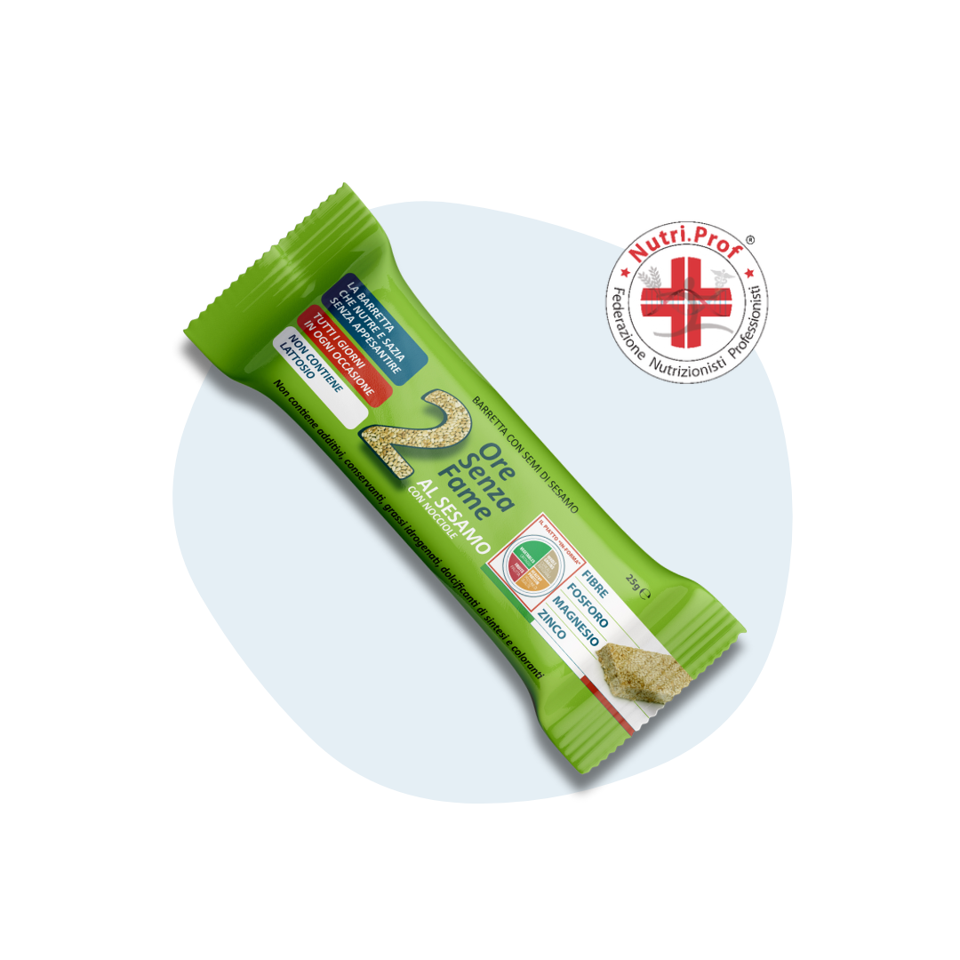 2 ore senza fame al Sesamo è stato formulato con: Semi di sesamo 68%, miele italiano, malto di riso, nocciole 7%.
